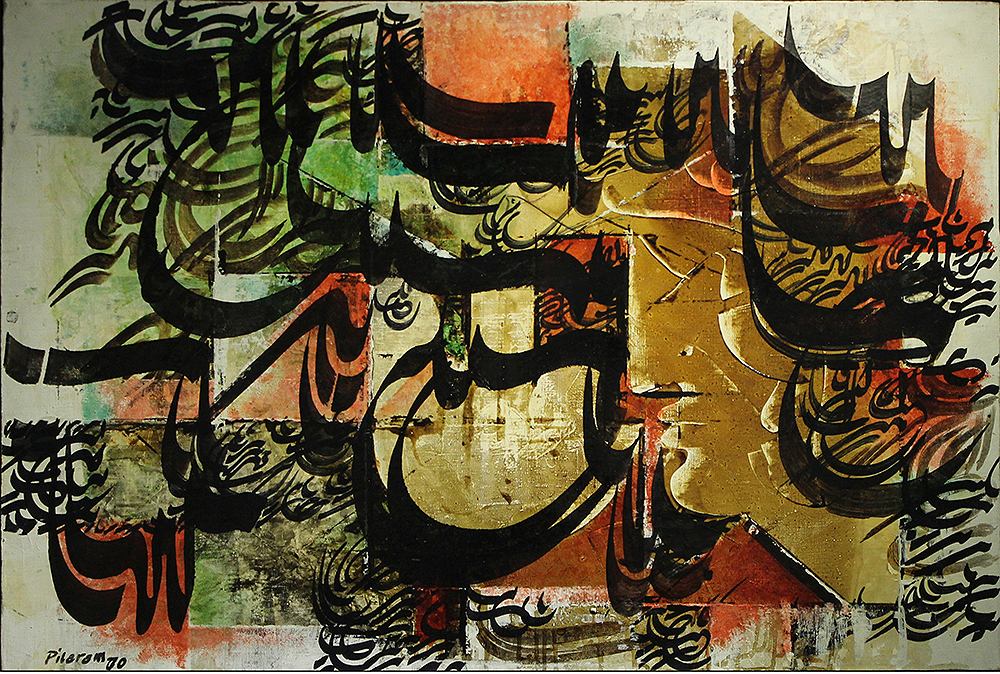 پیلارام همواره در پی به تصویر کشیدن نمادهای اصیل ایرانی بود. در کارهای اولیه اش مُهرهایی را که در قدیم به جای امضاء از آن استفاده میکردند، بزرگ نمایی کرد و زمینهای کتیبه گونه به وجود آورد و در آن نمادهای مذهبی، مانند عَلَم و پنجه، را با اشکال هندسی درآمیخت. او با علاقه و توجه به هنرهای سنّتی ایرانی، نظیر کاشیکاری و در مسیر یافتن راههای نو برای «ترکیب بندی» های جدید، و دریافت این مطلب که خط فارسی، بویژه نستعلیق، در تلفیق با نقاشی ویژگی ممتازی به تابلوها میبخشد، به آموختن خطاطی در انجمن خوشنویسان پرداخت و سپس مدتی در آنجا تدریس کرد.