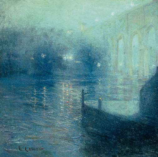 رودخانه ی هارلم در شب، انعکاس آبی/ 1908/ محل نگهداری: مجموعه ی بنیاد کریستی/ ابزار: رنگ و روغن روی بوم/ دوره، مجموعه و جنبش هنری: امپرسیونیسم- رئالیسم نیویورک