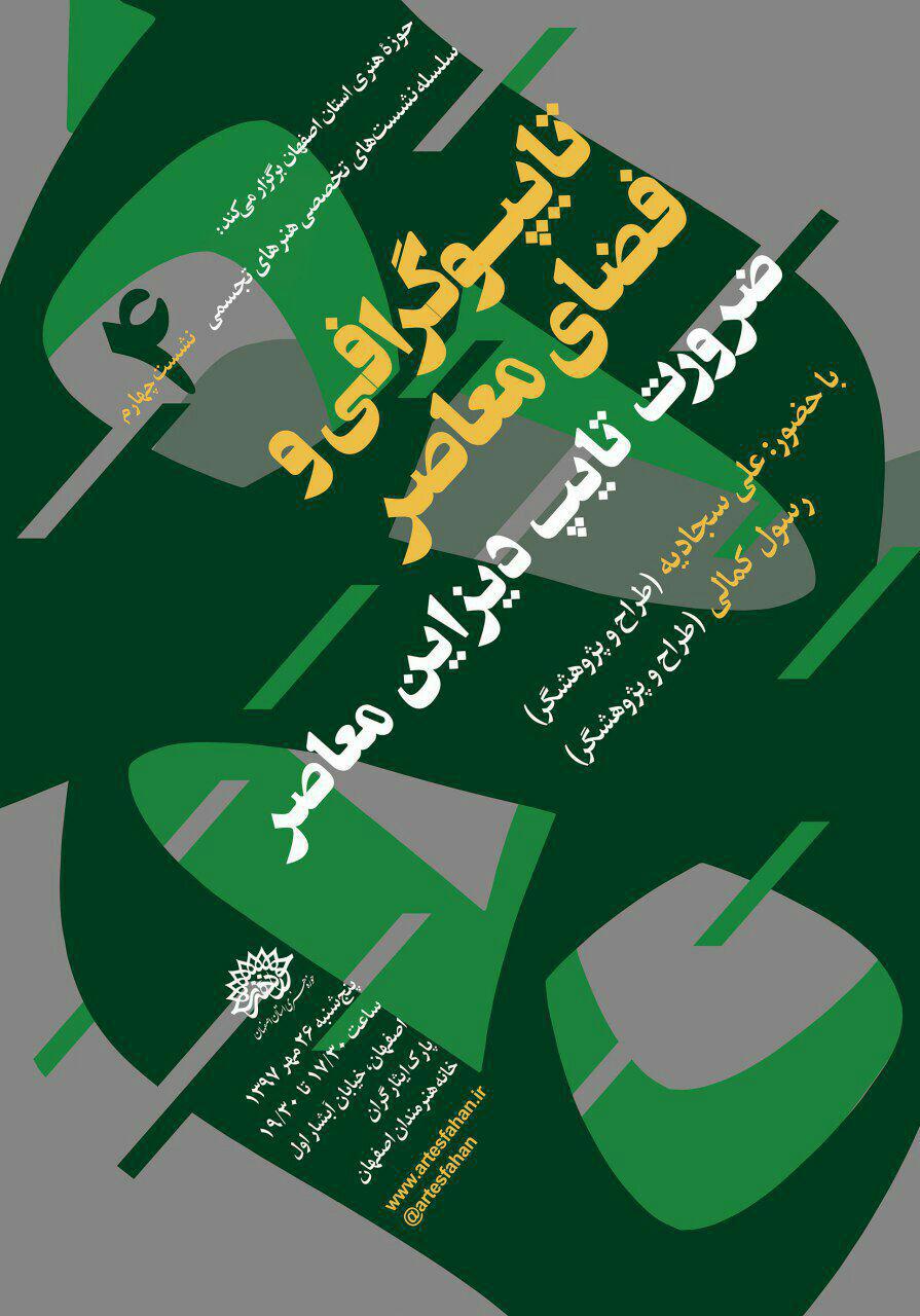 خانه تجسمی حوزه هنری استان اصفهان با دعوت از اساتید گرافیک نشست تخصصی هنرهای تجسمی این ماه خود را به موضوع تایپوگرافی اختصاص داده است.