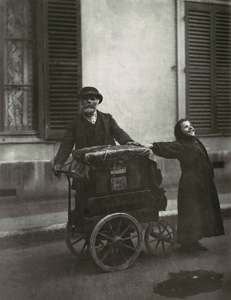 نوازنده ی دوره گرد و دخترکِ آوازه خوان، در گوشه ای از شهر پاریس، گیرایی خاصی به این عکسِ مشهور داده اند، البته حالت آن ها حسی مالیخولیایی دارد. حتی زمانی که عکاس از آن ها خواسته بود تا این چنین حالت بگیرند، به جهان واقعی تعلق نداشتند؛ درست همانند عکاس که با دوربینِ از مد افتاده ی خود نسبت به پیشرفت های تکنیکی، در مقابل آن ها ایستاده بود.